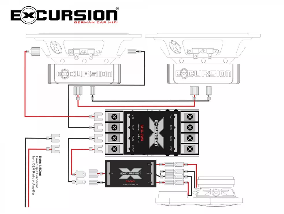 Wzmacniacze Excursion stabilne do 2 Ohm bez problemu współpracują z taką konfiguracją, zapewniając ogromną energię w dolnym paśmie i niezwykle dynamiczny charakter brzmienia.